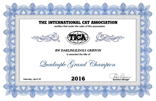 Griffon became a TICA Quadruple Grand Champion at the show held at the end of April 2016 in Augusta, Maine. In three shows he managed to accumulate a total of 5125 points, also making him a TICA Northeast Regional Winner for the year 2016.